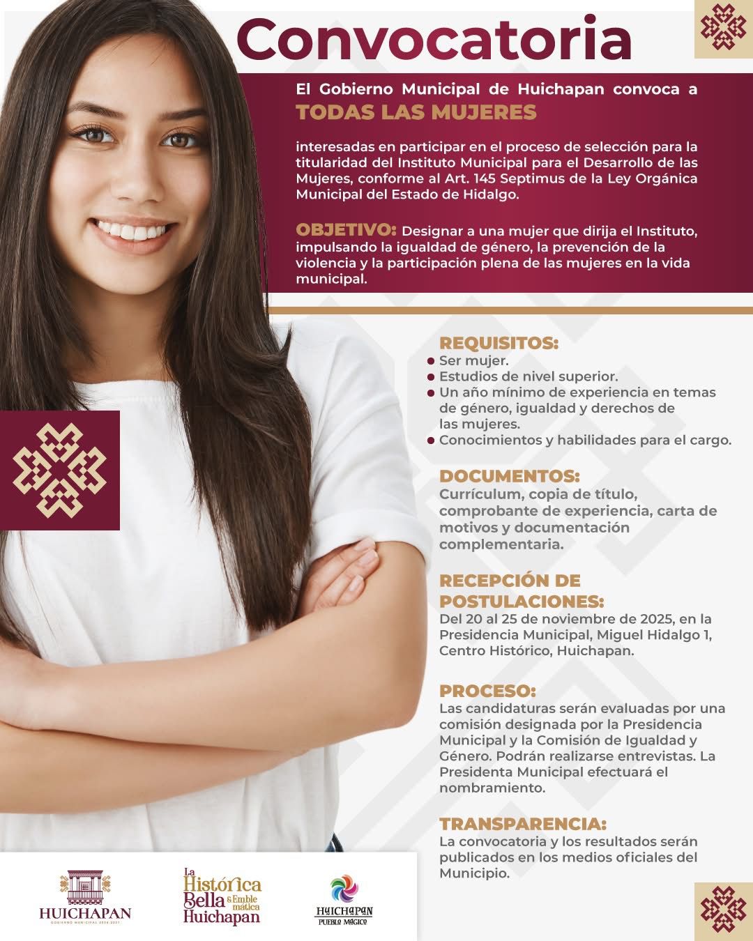 Consulta mas información referente al proceso de selección para ocupar la titularidad de la Instituto Municipal para el Desarrollo de las Mujeres, conforme al Artículo 145 Septimus de la Ley Orgánica Municipal para el Estado de Hidalgo.